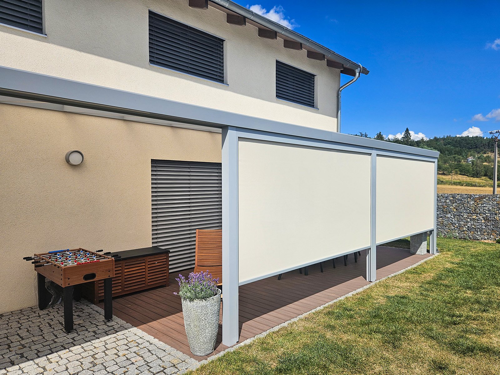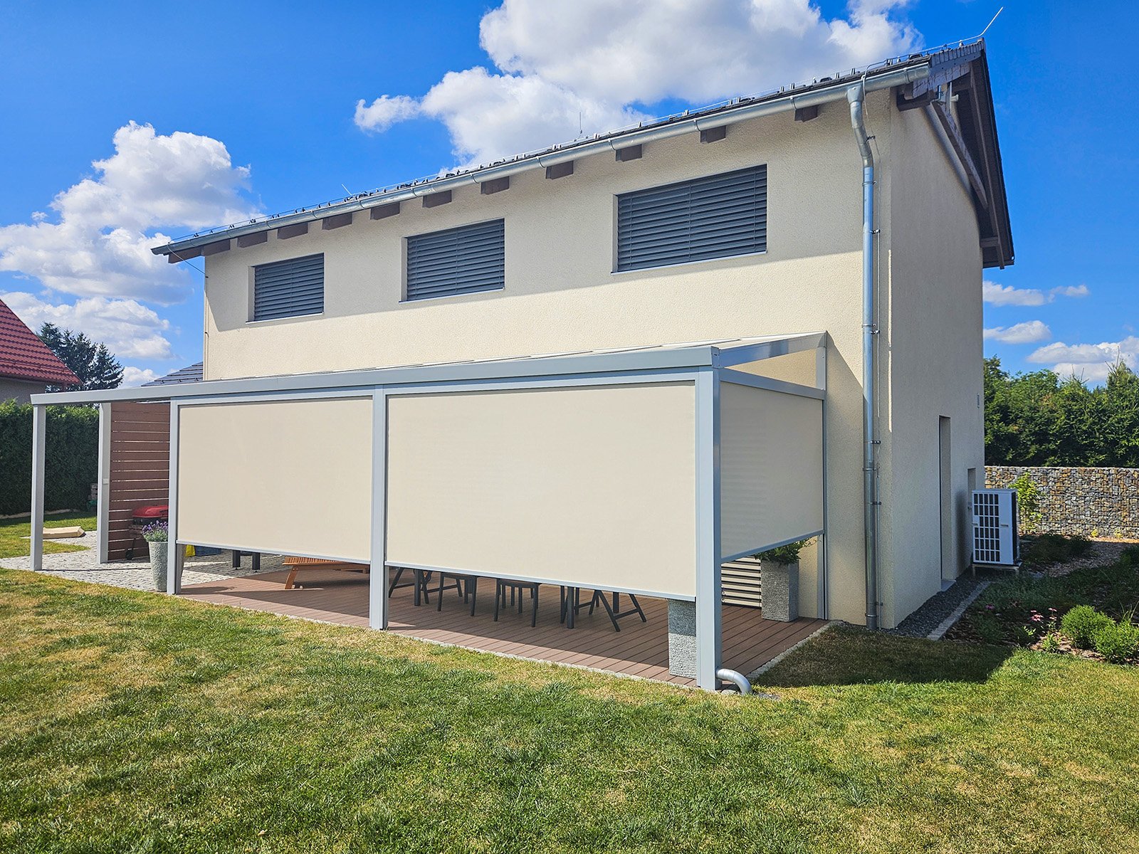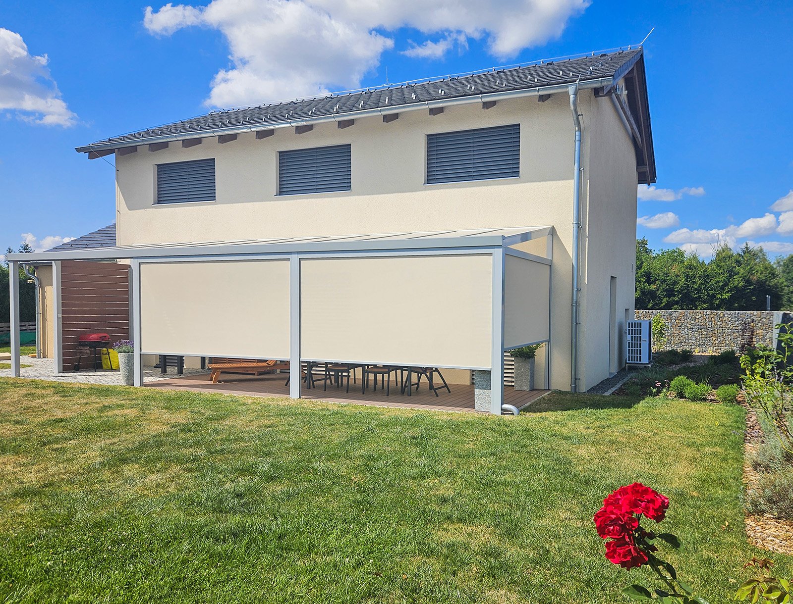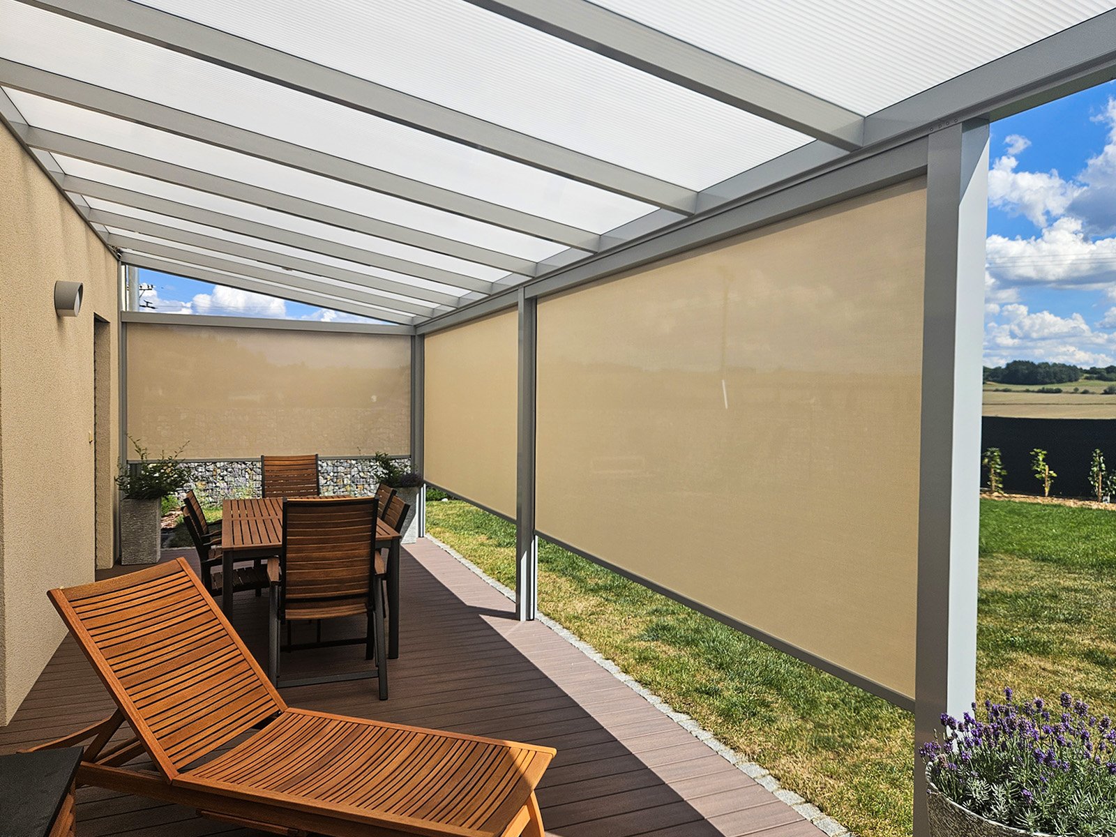 Majitelé domu v jihozápadních Čechách se na Maron obrátili s žádostí o zastínění pergoly s pevnou střechou na terase. Pergola jim slouží jako místo pro stravování na čerstvém vzduchu, relaxaci i aktivní odpočinek u stolního fotbálku. A k tomu všemu potřebovali příjemný stín, aby byla pergola v horkých letních dnech obyvatelná, zároveň však stále vzdušná.