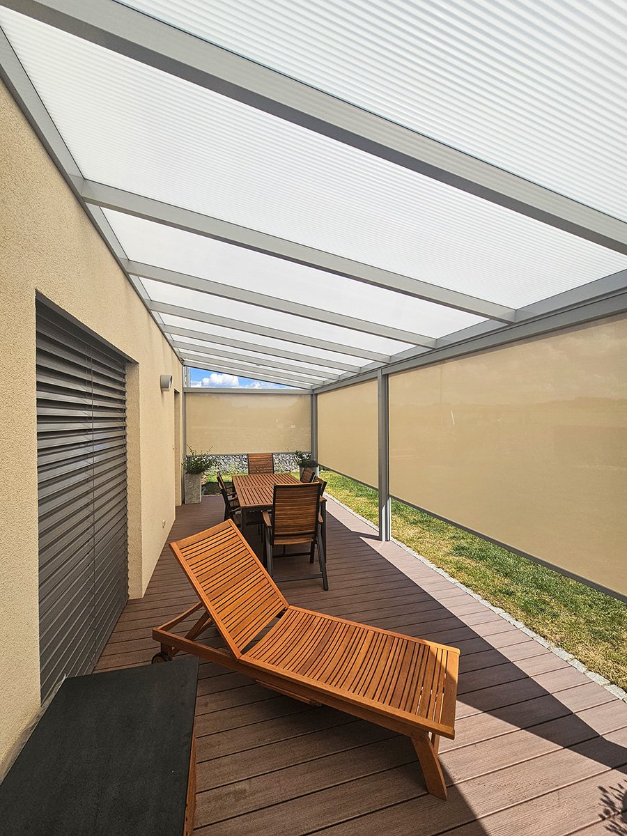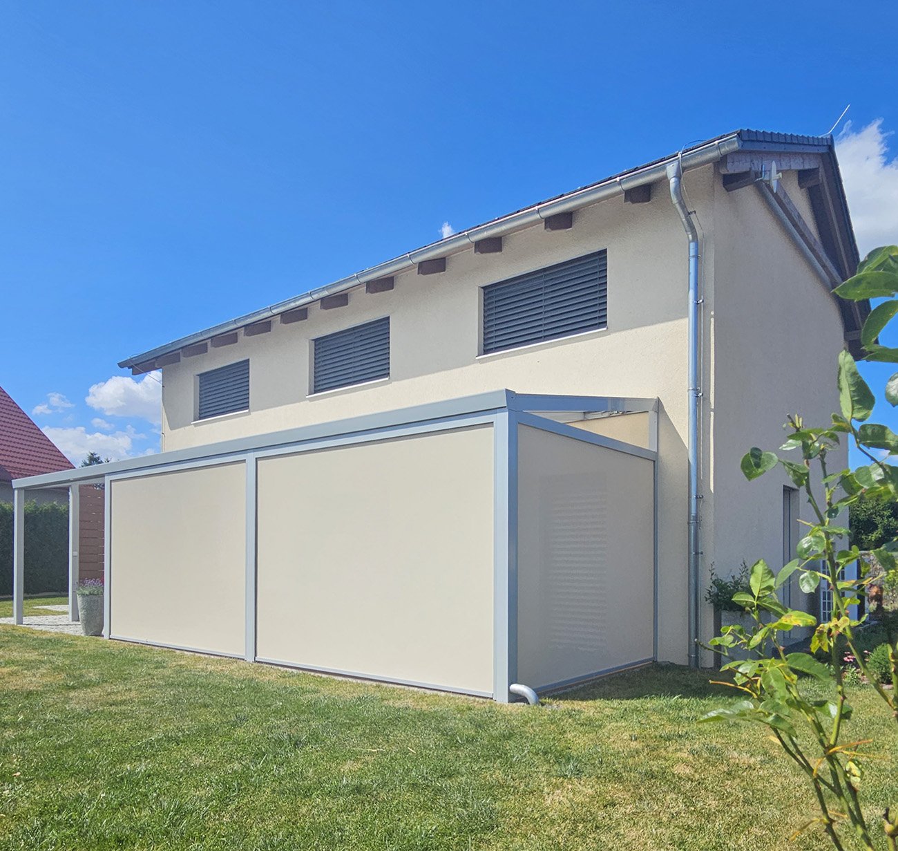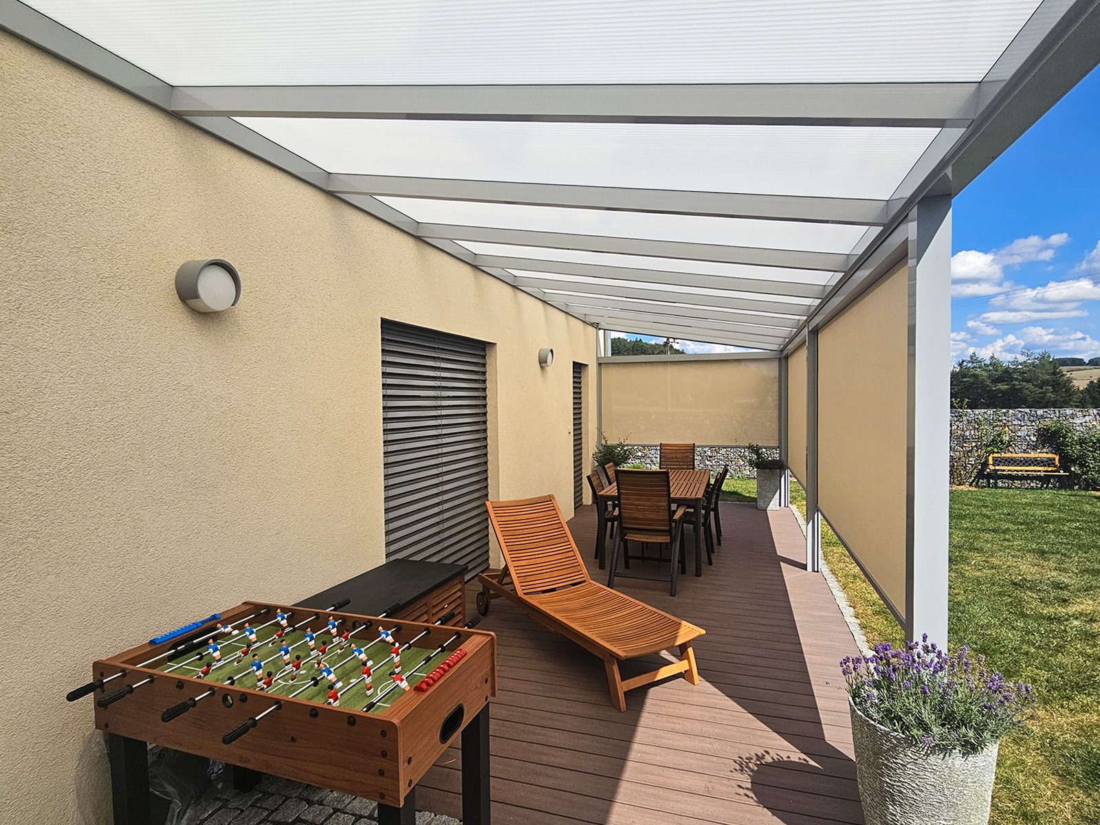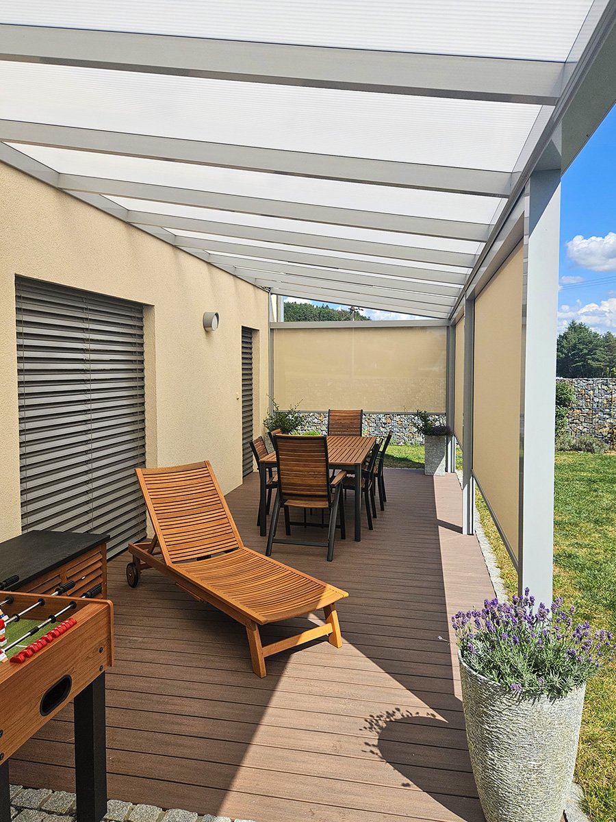 Majitelé domu v jihozápadních Čechách se na Maron obrátili s žádostí o zastínění pergoly s pevnou střechou na terase. Pergola jim slouží jako místo pro stravování na čerstvém vzduchu, relaxaci i aktivní odpočinek u stolního fotbálku. A k tomu všemu potřebovali příjemný stín, aby byla pergola v horkých letních dnech obyvatelná, zároveň však stále vzdušná.