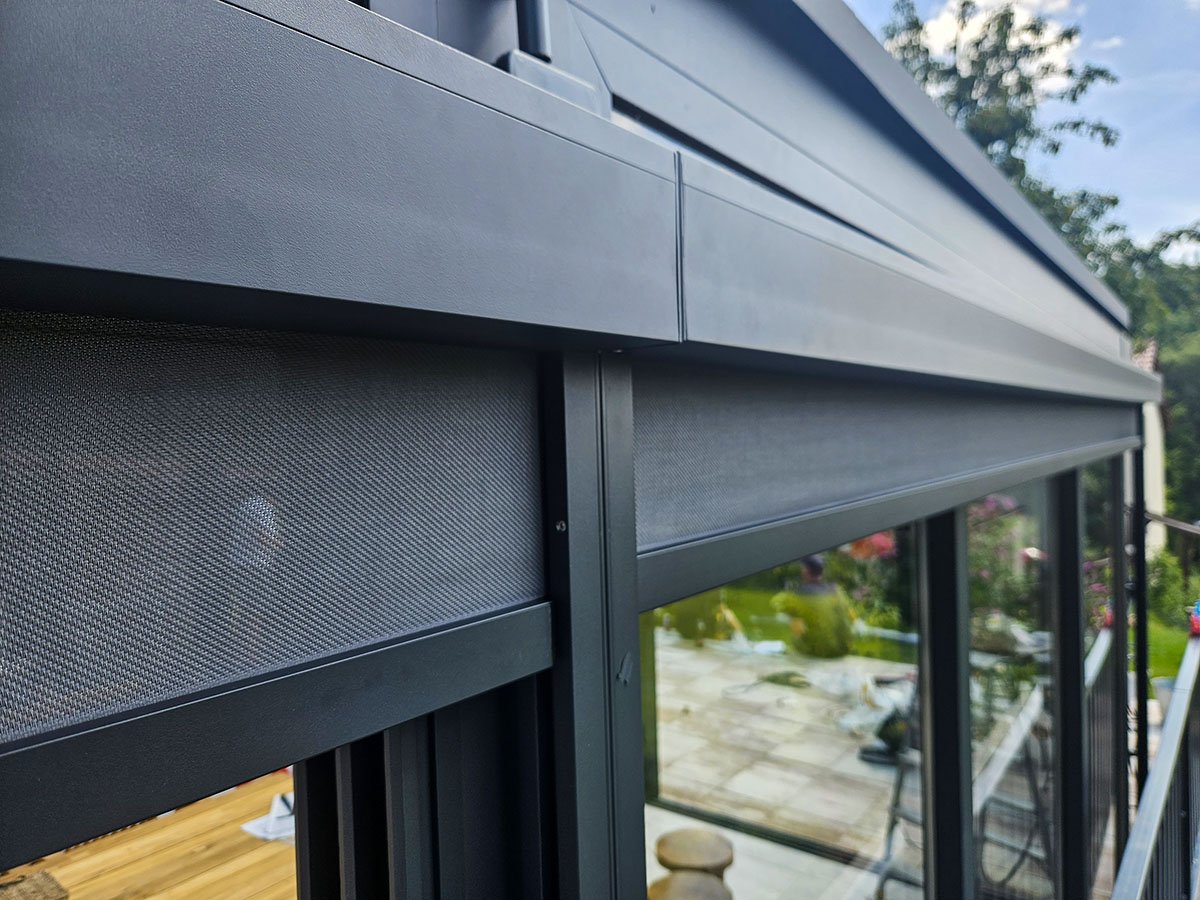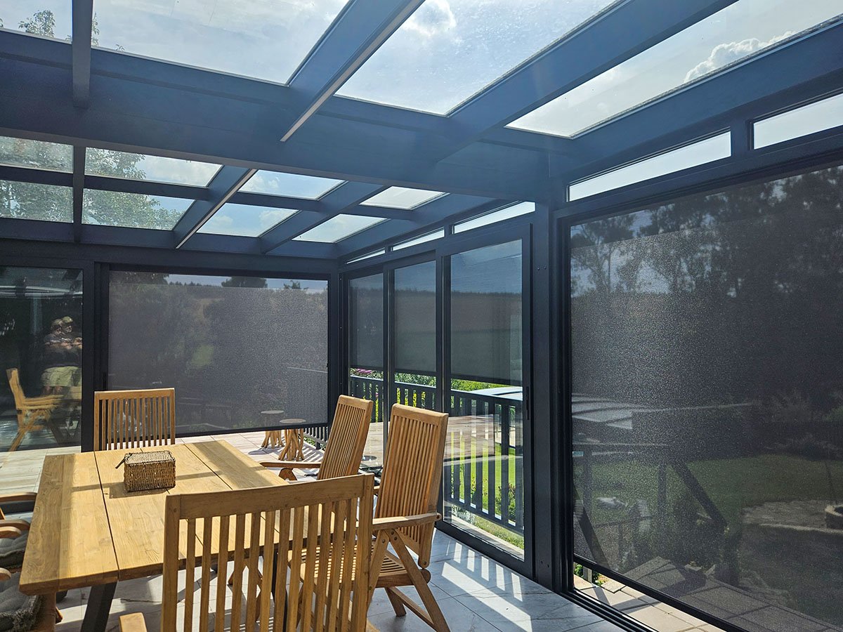 - Rozsáhlá zimní zahrada o šířce a hloubce cca 7 m vyžadovala důkladné stínění. Boční stěny jsme opatřili screenovými roletami se zipovým vedením, odolnými proti větru – ty zajišťují stabilitu a eleganci i při zatažení.