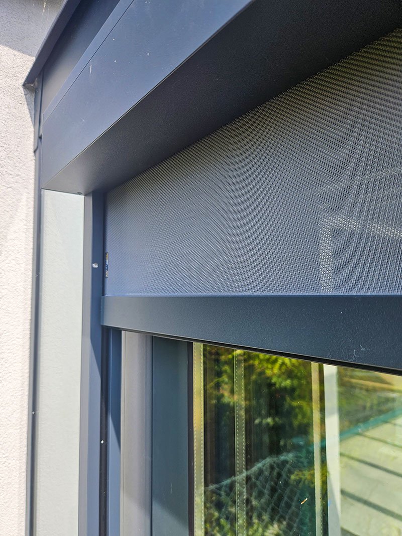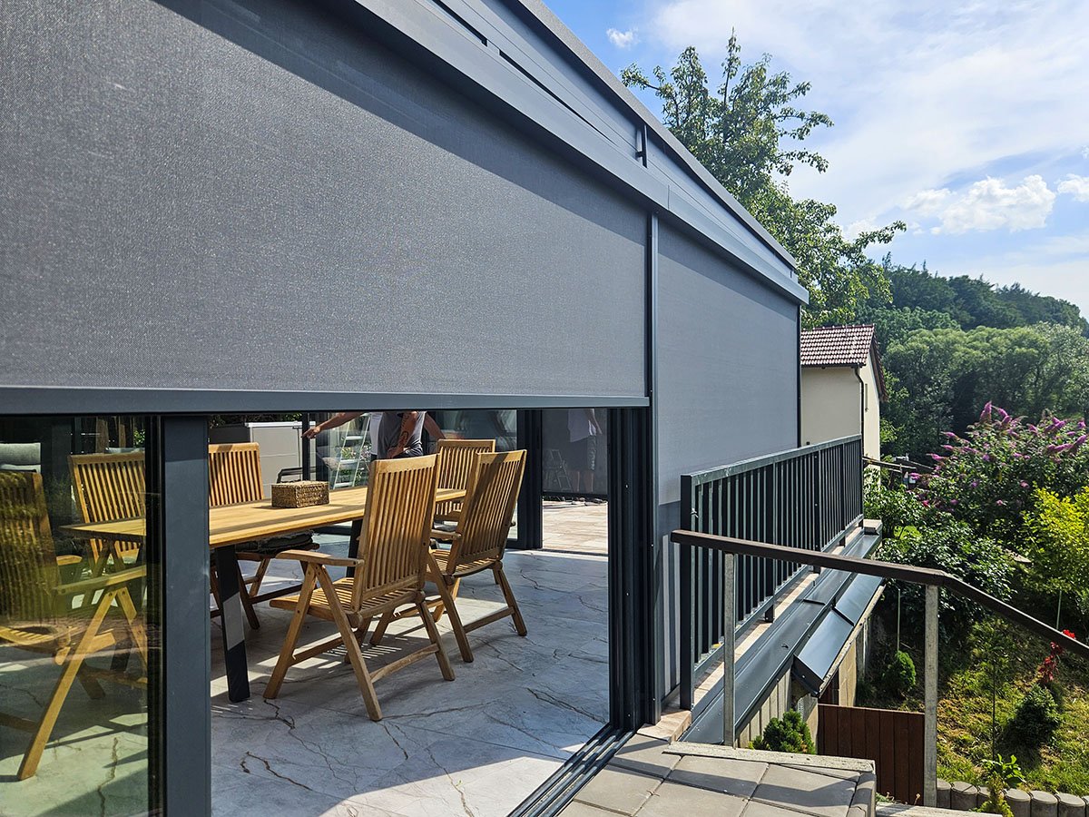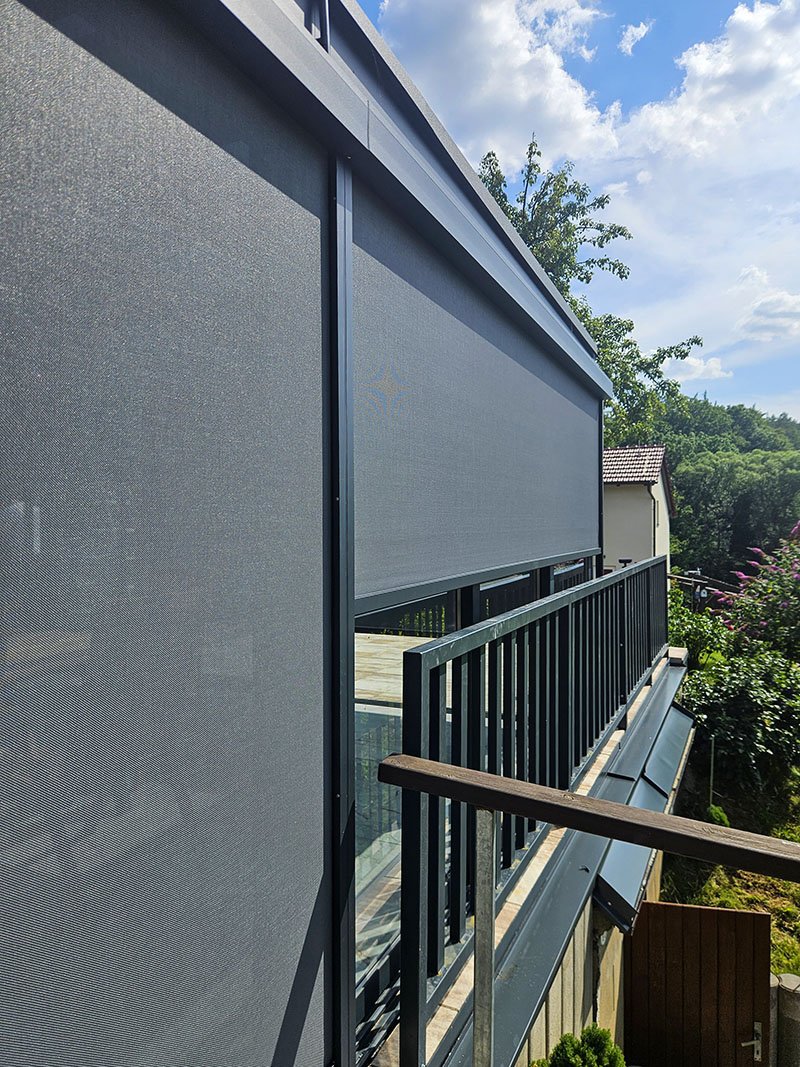 - Na obě stínicí plochy (boční i střešní) jsme použili stejné speciální screenové tkaniny v barvě antracit, které opticky sjednotily celé řešení.