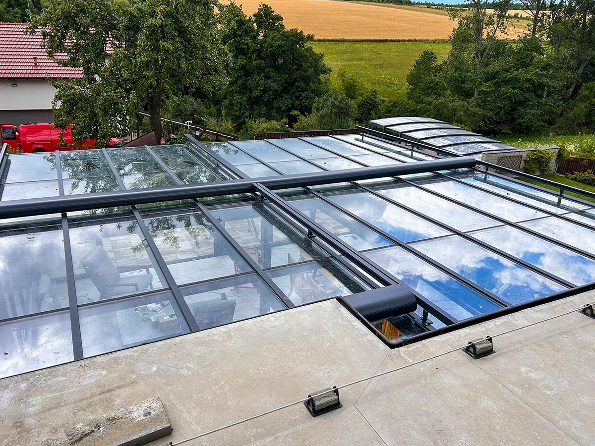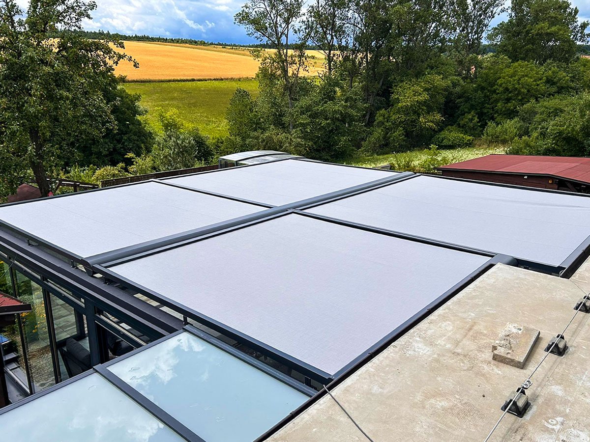 - Pro střechu jsme zvolili střešní systém markýz s podporou, který jsme navrhli tak, aby dokonale kopíroval nepravidelný tvar střechy zimní zahrady.