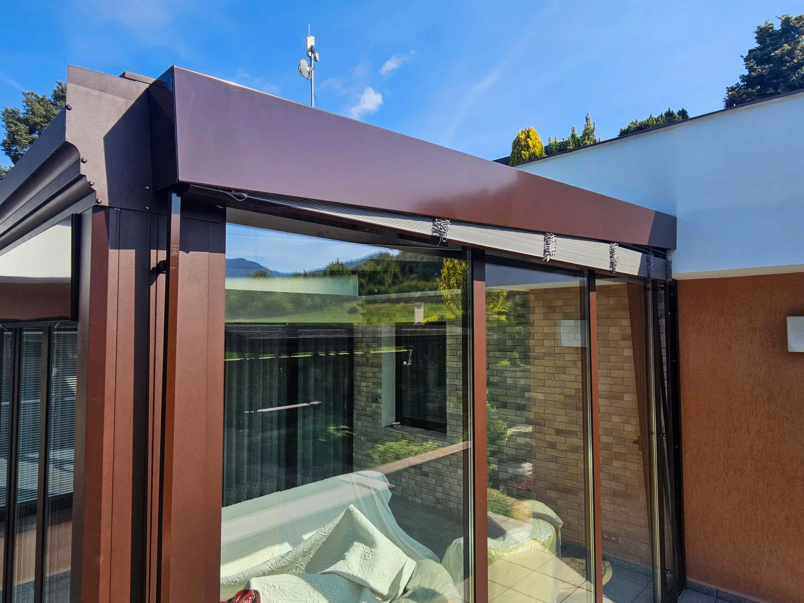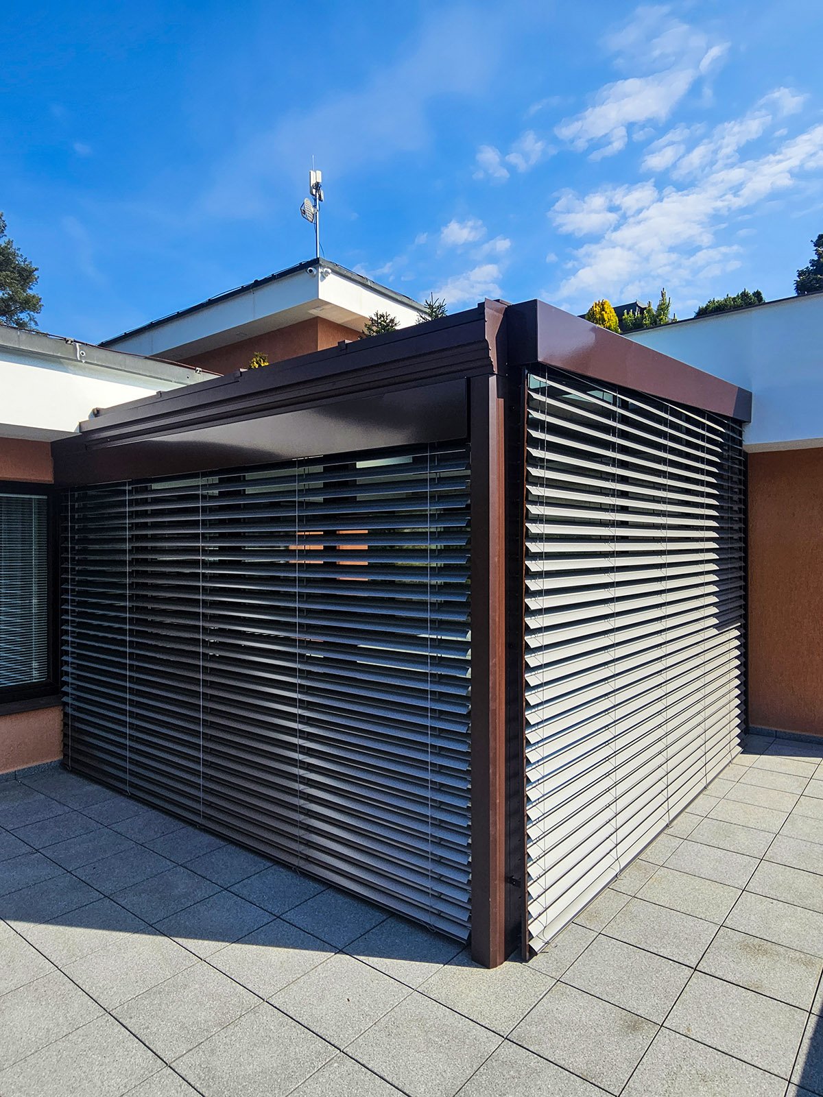 Při výběru barev jak lamel, tak i vodicích lišt jsme se s klienty trefili přesně. Při pohledu na zimní zahradu vše vypadá, jako kdyby tam venkovní žaluzie byly odjakživa. Obyvatelé rodinného domu nově ale budou moci zimní zahradu využívat i během horkých dní.